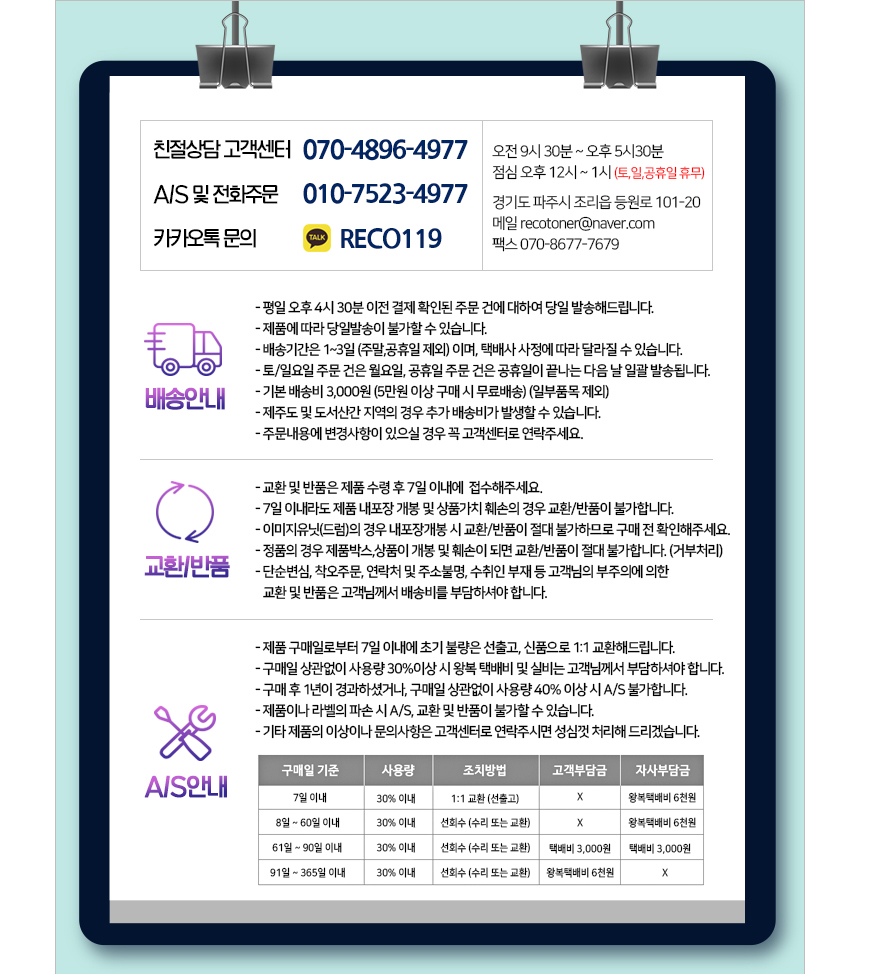토너닷컴 교환·반품 및 A/S 규정 안내